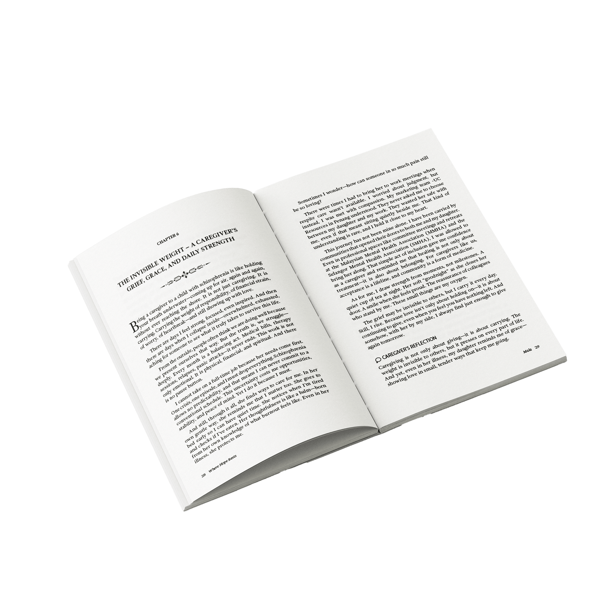 Where Hope Rests: A Caregiver’s Story is the heartfelt journey of a mother walking beside her daughter through the storms of mental illness. When Mala’s youngest daughter, Visha, was diagnosed with schizoaffective disorder, life changed forever—but so did Mala’s mission to turn pain into purpose. She shares the missed signs, relapses, and fragile moments of hope that shaped their path, showing how love, structure, and community nurture resilience. Their journey also gave rise to Suara Minda, the centre founded by Visha to champion creative therapies and inclusion. Tender and inspiring, this memoir offers hope to families and caregivers.
